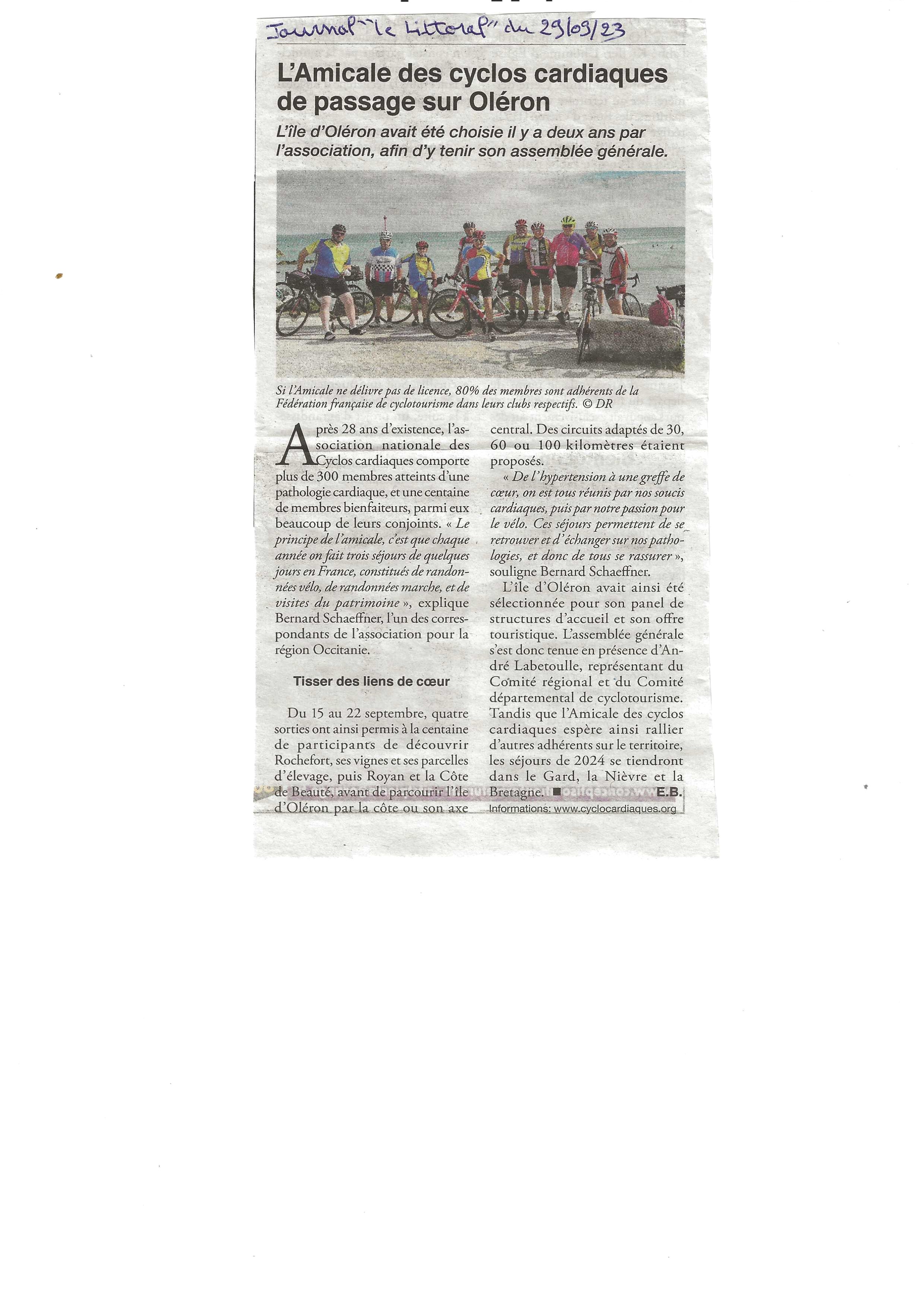 Article "Le Littoral - Ile d'Oléron " : L'amicale des cyclos cardiaques à Oléron Septembre 2023