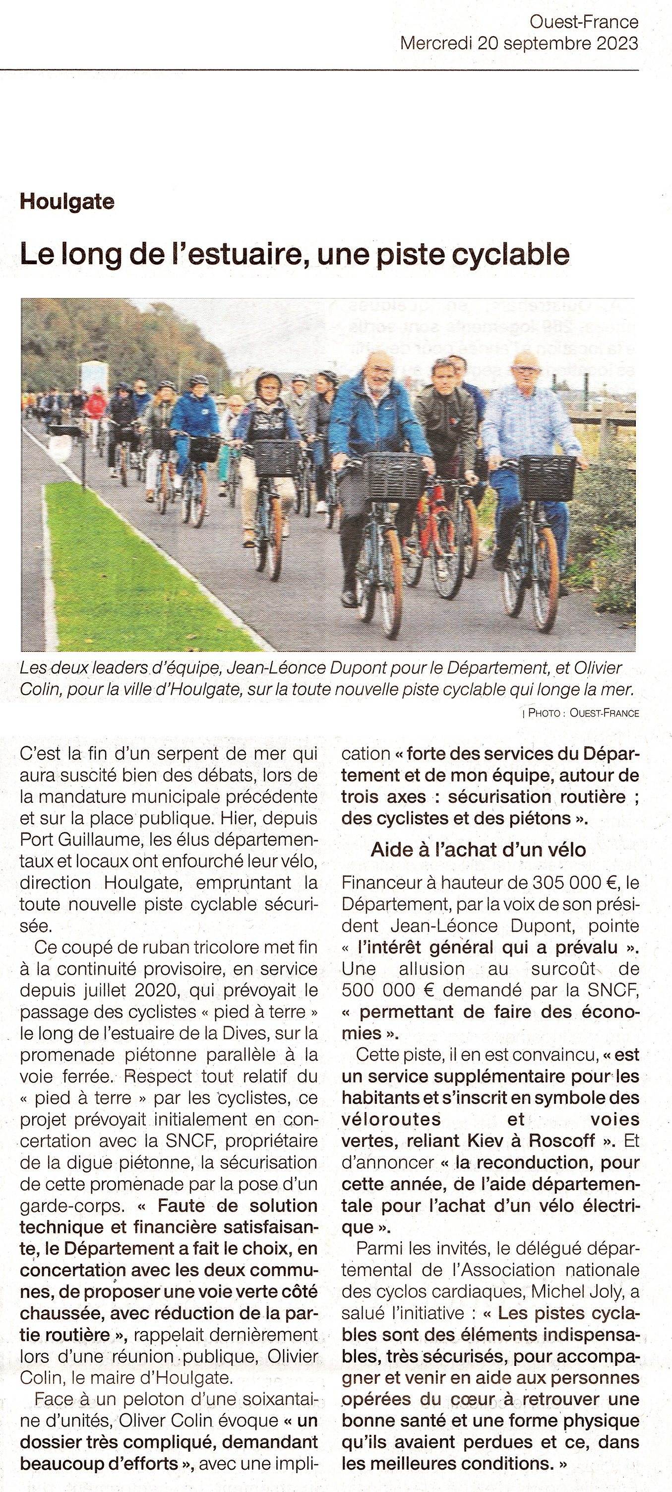Article "Ouest France " : Inauguration piste cyclable (Houlgate/ Calvados) Septembre 2023
